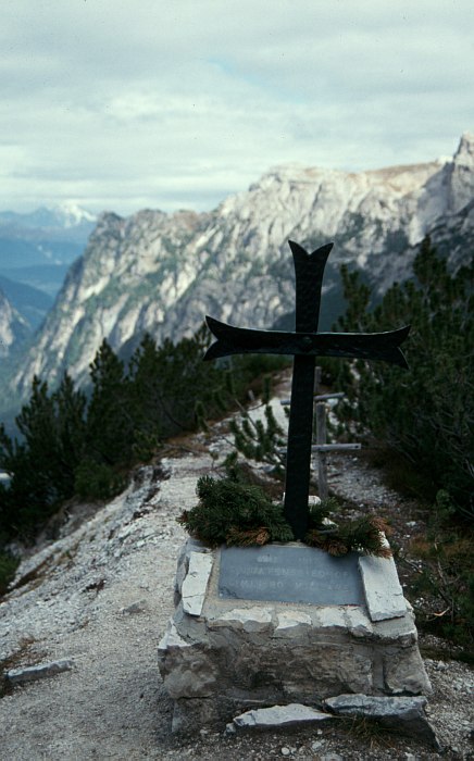 Monte Piano (2301 m); Gedenkkreuz bei aufgelassenen Soldatengräbern auf der Nordseite des Berges im Pionierweg vom Dürrensee zum Gipfel