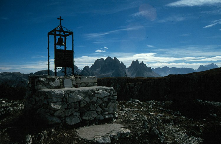 Monte Piano (2301 m); in der Bildmitte Gruppo di Cadini (Cadini di S. Lucano, 2839 m), rechts dahinter Gruppo delle Marmarole, ganz rechts Monte Antelao (3263 m)