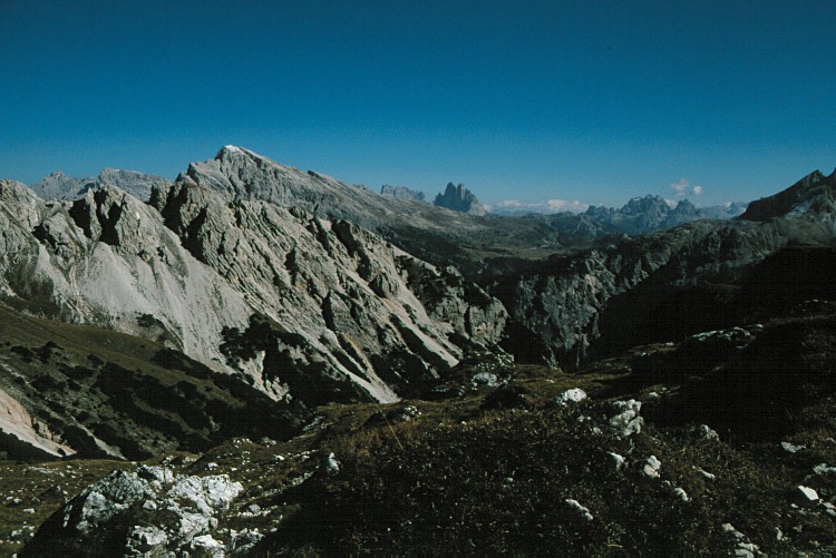 Von links: Birkenkofel, 2905 m, Dreischuster Spitze, 3152 m, Dürrenstein, 2839 m, Zwölferkofel, 3094 m, Drei Zinnen, 2999 m, und Monte Cristallo, 3221 m