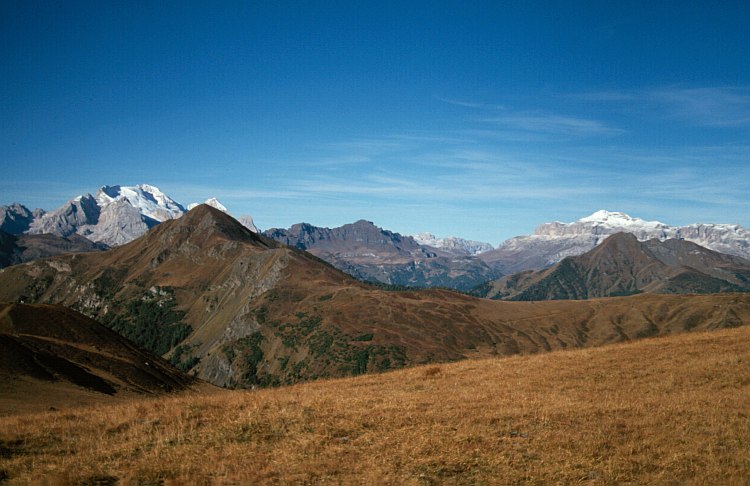 de Padon mit La Mesolina (2642 m) und rechts die Sella Gruppe mit dem Piz Boè (3152 m).