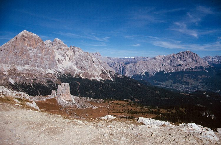 Von links: Tofane di Rozes o. I., 3225 m, knapp rechts daneben Tofane di Dentro o. III., 3238 m, Tofane di Mezzo o. II., 3244 m, rechts Monte Cristallo, 3221 m, im Vordergrund Cinque Torri, 2361 m