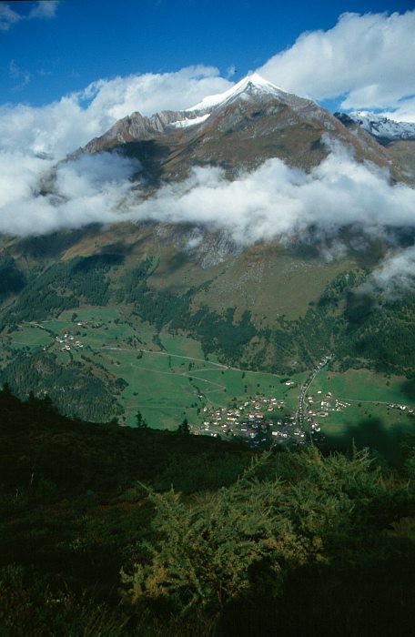 links Saukopf (2822 m), dann Vorderer Sajatkopf (2913 m), darüber an den Wolken Hinterer Sajatkopf (3098 m), unten das Virgental mit Prägraten