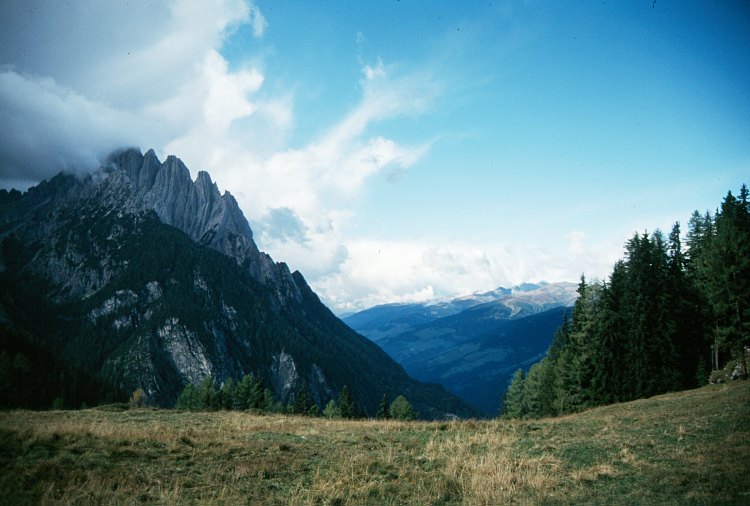 von links: Spitzkofel (2718 m), Spitzkofeltürme (2665 m) an der Wolkenbasis, Oberwalder Turm (2612 m), Grauer Turm (2514 m) und Bischofsmütze (2431 m)
