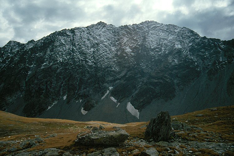Nordwand der Alplesspitze (3149 m) vom Rudolf-Tham-Weg; tief unten fließt der Trojer Alm Bach