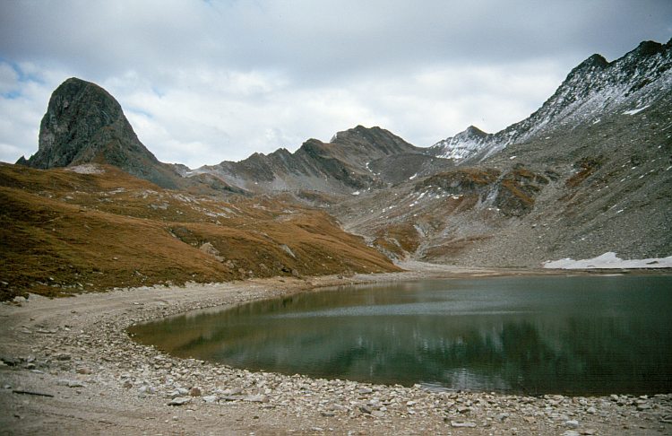 Links die Gösles Wand (2912 m), davor der Böden See (2576 m). In der Bildmitte doppelgipfelartig die Finsterkarspitze (3028 m), rechts der Kesselpater (2985 m).