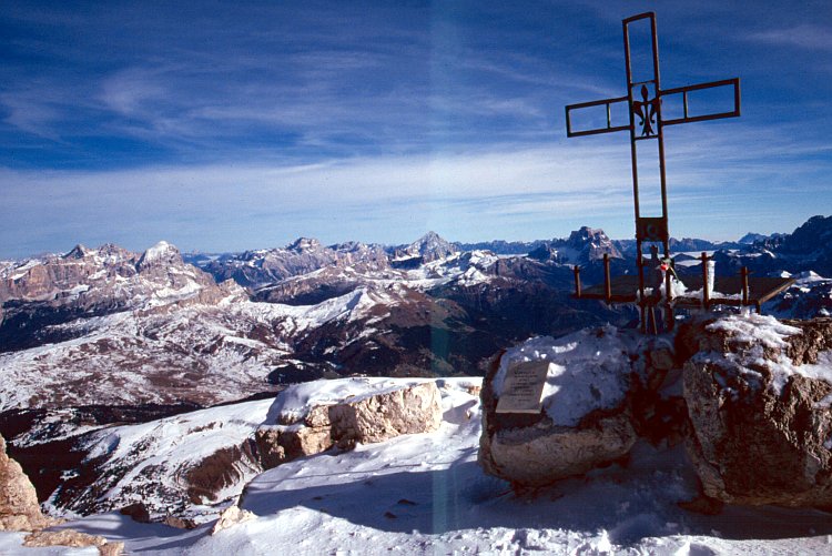 Blick vom Piz Boè (3512 m) mit Gipfelkreuz von links: Die Le Tofane mit der