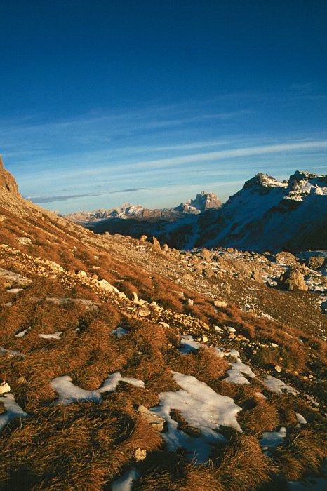 von links: Punta Sorapis (3205 m), Monte Pelmo (3168 m), Crepes de Padón mit La Mesola und La Mesolina (2642 m)