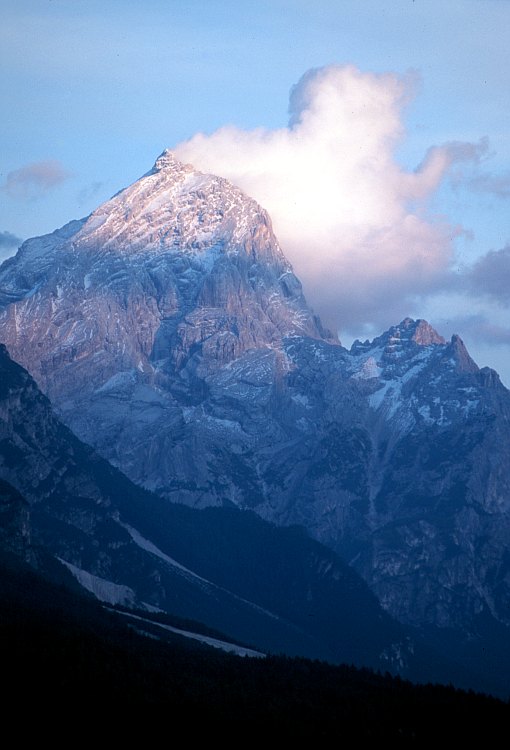 Monte Antelao (3264 m) mit Gipfelwolke, rechts Forcola Salvella (2455 m) und Cima Salvella (2556 m)