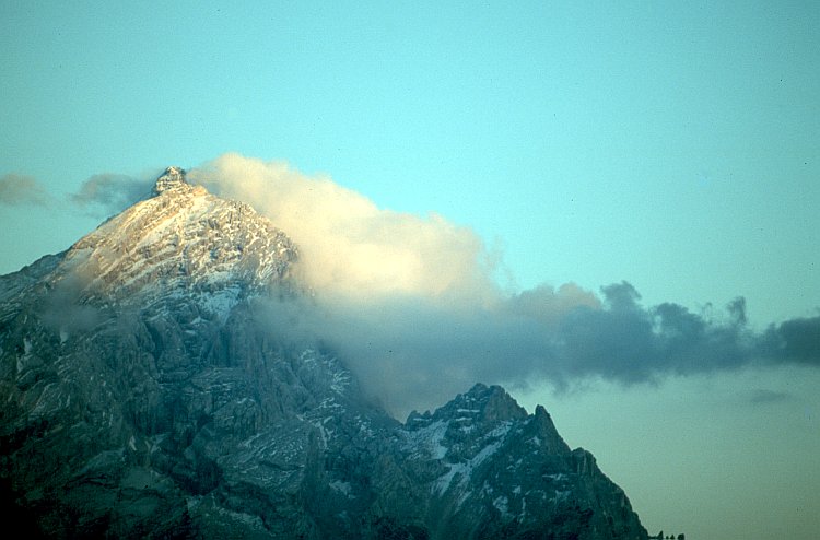 Monte Antelao (3264 m) mit Gipfelwolke, rechts Forcola Salvella (2455 m) und Cima Salvella (2556 m)