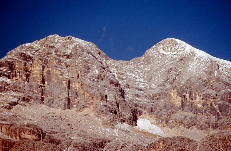 Links Tofane di Mezzo (3244 m) mit Bergstation der Seibahn und Tofane di Dentro (3238 m)