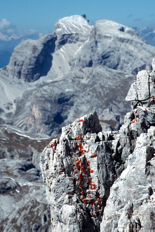 Im Vordergrund sorgen Flechten im Gipfelbereich des Paternkofels (2744 m) für einige Farbtupfer. Der Birkenkofel (2922 m) und der Hoch- (2905 m) und Unterebenkofel (2705 m) beherrschen den Hintergrund.