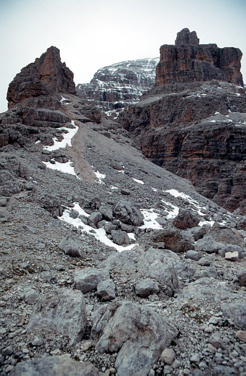 Im Vallon. Hoch droben überzieht sich die Tofana di Ròzes (3225 m) mit Schnee und Eis.