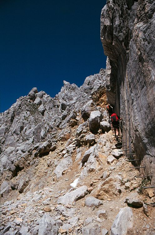 Eisensprossen an einer Felswand sorgen hier für Abwechslung in der Route zur Ellmauer Halt (2344 m).