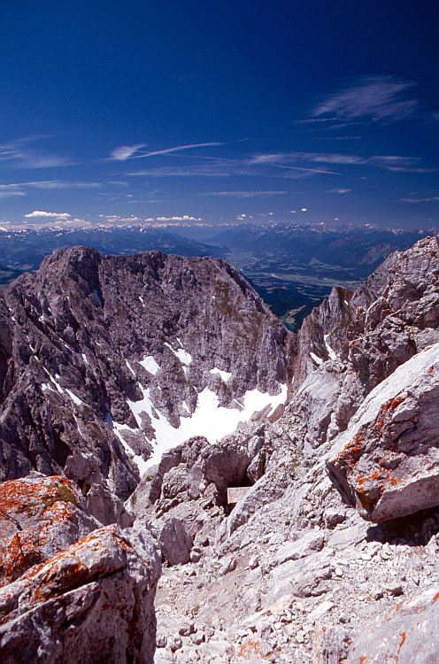 Blick vom höchsten Gipfel des Wilden Kaisers, der Ellmauer Halt (2344 m), auf das Tuxeck (2226 m). Am rechten Bildrand der Treffauer (2304 m). Im Hintergrund das Inntal.