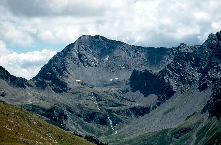 Blick durch das Tal des Tramin-Bachs auf das Tagewaldhorn oder Corno di Tramin (2708 m). Links der Einschnitt der Tramin - Scharte (2380 m).