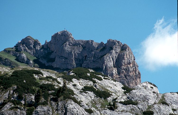 Der Roßkopf (2246 m) mit seinem Gipfelkreuz, dahinter links die Seekart Spitze (2261 m).