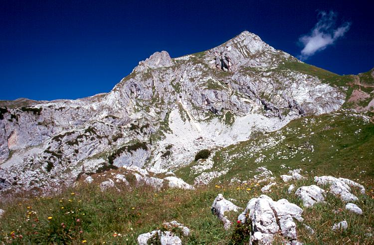 Die Südflanke des Hochiss (2299 m), höchste Erhebung im Rofangebirge. Rechts das Spieljoch (2236 m).