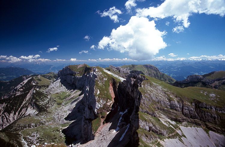 Blick vom Gipfel des Hochiss (2299 m) nach Osten über die Bergwelt im Rofangebirge. Der linke Gipfel hinten gab dem Gebirge seinen Namen: Die Rofanspitze (2259 m).