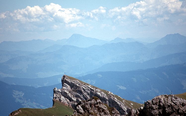 Blick vom Gipfel des Hochiss (2299 m) nach Osten auf den Sagzahn (2228 m) mit seinem Gipfelkreuz.