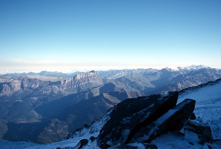 Vom Montblanc-Massiv (Frankreich) geht der Blick weit nach Ostnordosten bis hin zu den Großen im Berner Oberland, die am rechten Bildrand auftauchen. Tief unten das lŽArve-Tal, links unten der Ort Servoz.