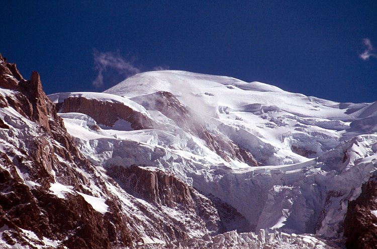 Links die Flanke des Mont Maudit (4465 m), in der Mitte beherrscht der Montblanc (4807 m) die Szenerie.