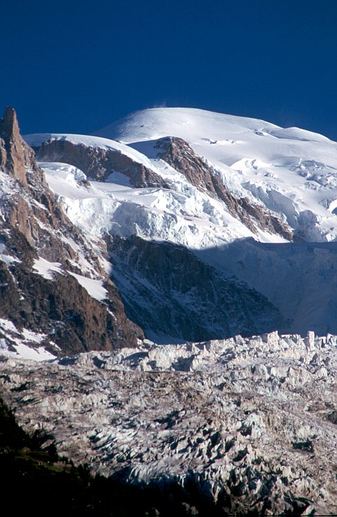 Am linken Bildrand der Mont Maudit (4465 m). In der Mitte die Kuppe des Montblanc (4807 m). Vorne der Glacier des Bossons.