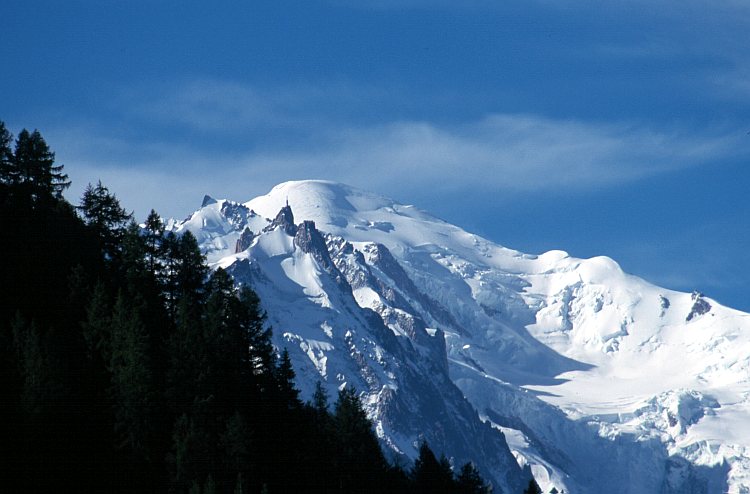 Über der Aiguille du Midi (3842 m) mit der Mastspitze erhebt sich der Montblanc (4807 m).