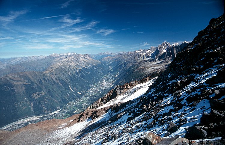 In der linken Bildhälfte als höchstes Erhebung Aiguille Verte (4122 m). Tief unten das Tal der l'Arve mit Chamonix-Mont Blanc (1030 m).