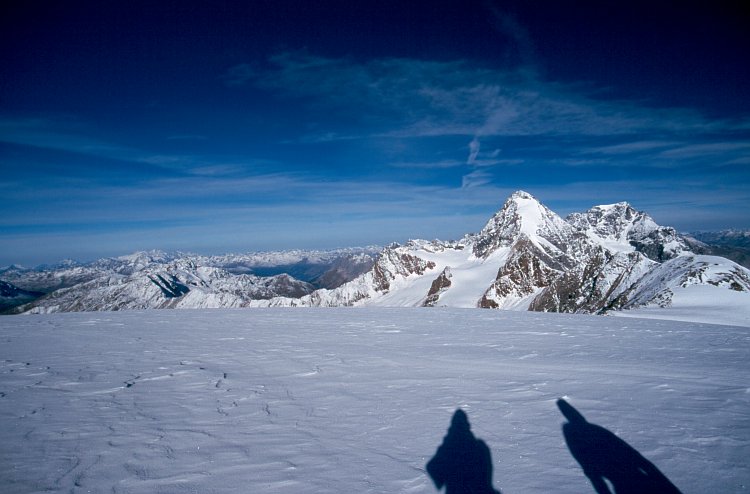 Auf dem Zufallferner. Blick auf die Königs Spitze (3851 m) und den Ortler (3905 m) rechts.
