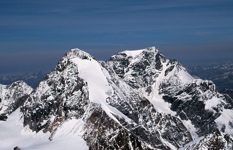 Blick vom Monte Cevedale (3769 m) auf die Königs Spitze (3851 m) links und den Ortler (3905 m) mit dem Hintergrat.