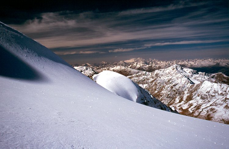 Auf dem Zufallferner. In der Bildmitte mit dem geschwungenen Grat der Monte Pasquale (3553 m), rechts der Monte Confinale (3370 m). Ganz im Hintergrund der Piz Bernina (4049 m).