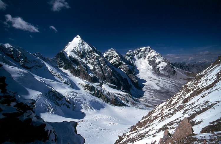 Das Dreigestirn: Die Königs Spitze (3851 m), Monte Zebrù (3735 m) und der Ortler (3905 m) mit seinem Hintergrat. Unten der Suldenferner.