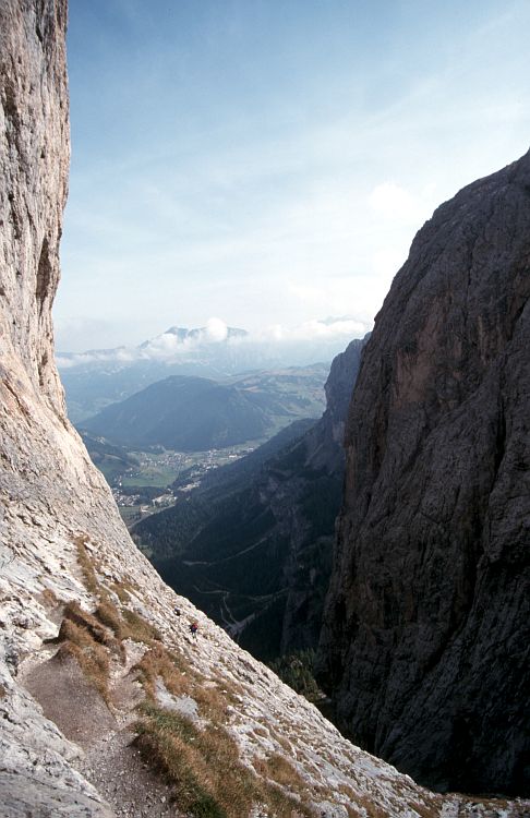 Die Nordabstürze des Sella-Massivs in der Nähe des Grödner-Jochs. Tiefblick vom Pisciadù-Klettersteig. Links der Exnerturm.