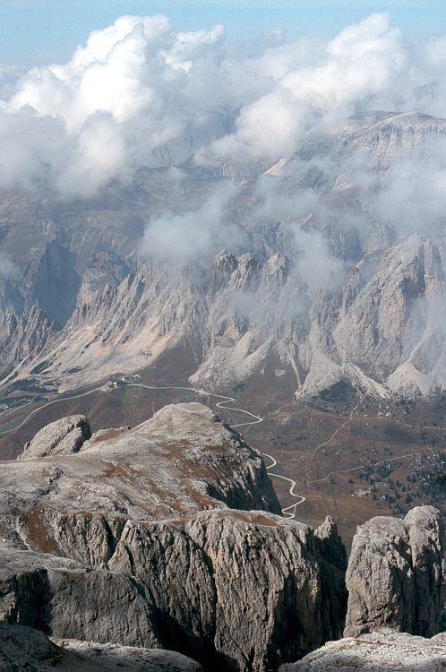 Blick von der Pisciadù Spitze (2985 m) über die Nordabstürze des Sella-Massivs Richtung Grödner Joch.