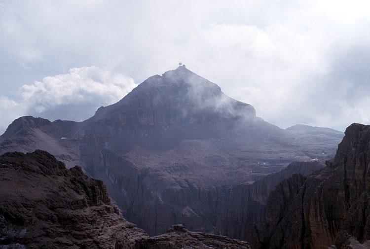 Blick von der Pisciadù Spitze (2985 m) nach Süden zwischen der Bamberger Spitze (2964 m) links und dem Sass de Mesdi (2970 m) hinduch zum pyramidenförmigen Gipfelaufbau des Piz Boè (3152 m) mit der Cap. Piz Fassa.