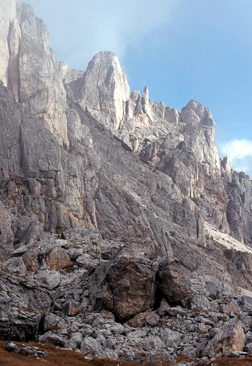Wild zerklüftete Ostflanke der Ra Gusela (2595 m), zeitweise in Nebelschwaden gehüllt.
