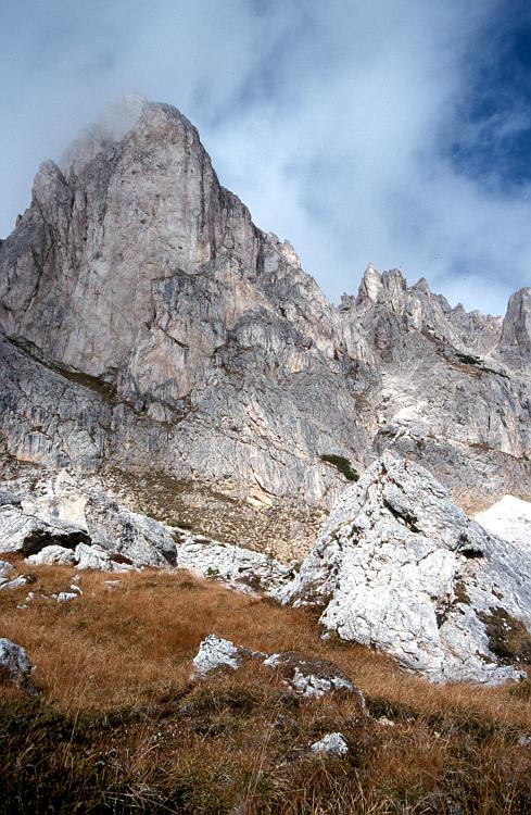 Wild zerklüftete Ostflanke der Ra Gusela (2595 m), zeitweise in Nebelschwaden gehüllt.