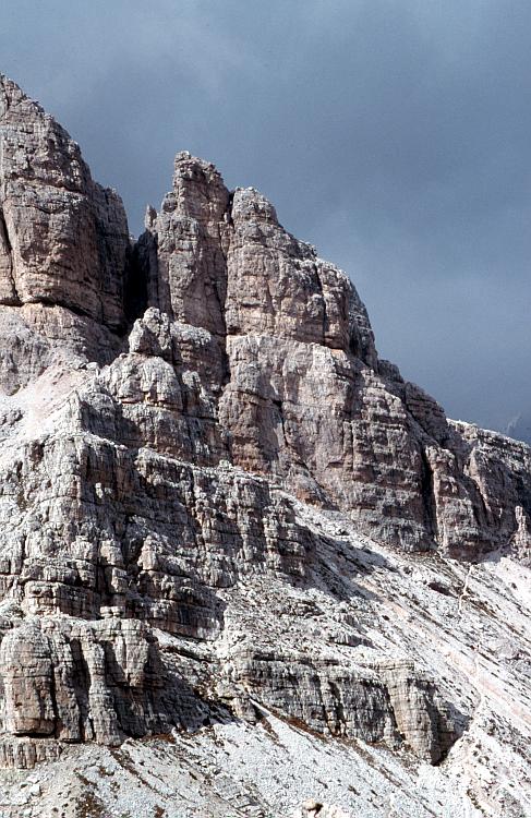 Die Ostflanke des Averau (2647 m). Rechts zieht sich der Weg hinauf zum Einstieg zur klettersteigartigen Route zum Gipfel.