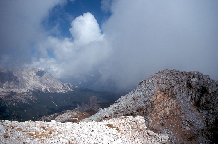 Auf dem Gipfel des Averau (2647 m). Blick nach Südosten auf einem Nebengipfel. Weit unten in der Bildmitte und im Schatten die Cinque Torri (2361 m). Links im Hintergrund die Le Tofane.