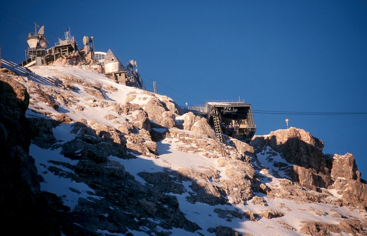 Die Südwand der Zugspitze (2962 m) mit der Bergstation der Seilbahn vom Gletscherbahnhof. Der eigentliche Gipfel befindet sich ganz rechts im Bild.