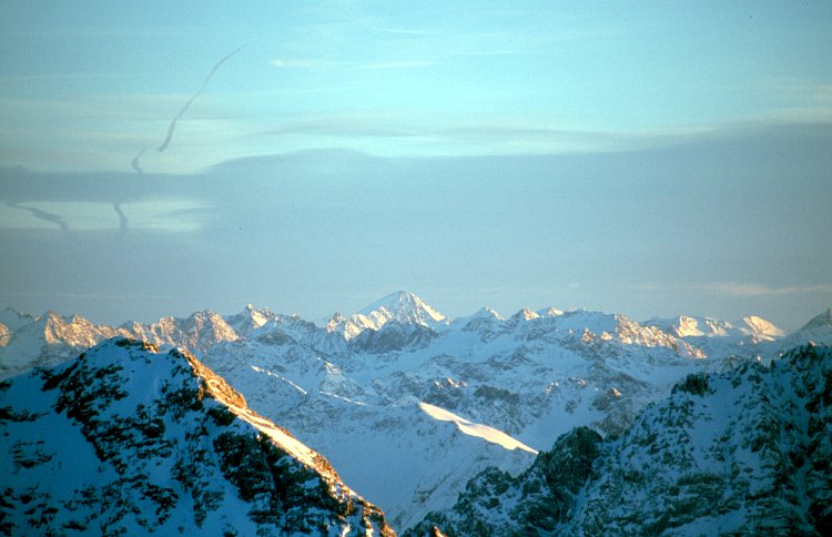 Wettersteingebirge. Dahinter Mieminger, ganz hinten die Stubaier Alpen mit dem Habicht (3277 m).