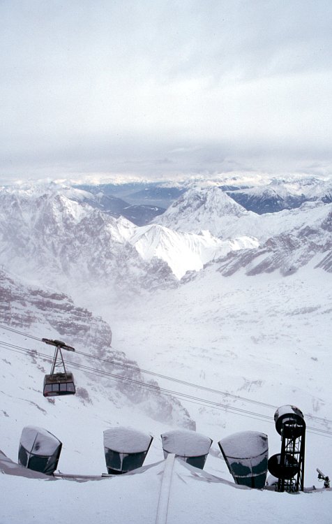 Die Zugspitze (2962 m). Im Bild die Seilbahn hinunter zum Gletscherbahnhof im Platt.