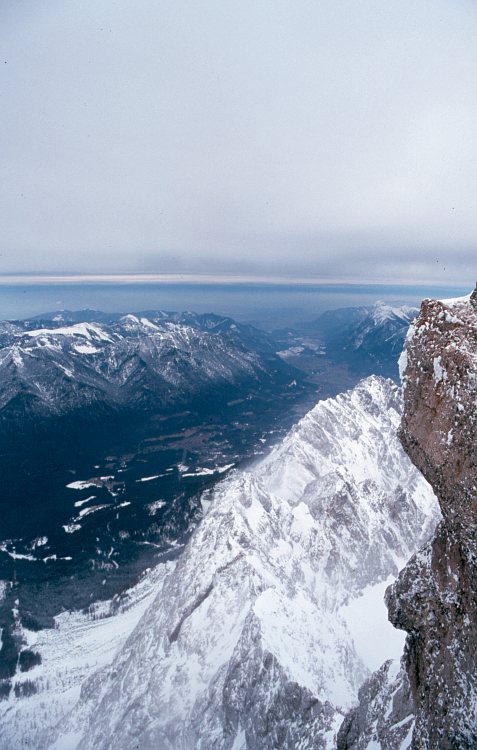 Die Zugspitze (2962 m). Unten das Tal der Loisach. Links die Ammergauer Alpen. Rechts unten der Waxenstein (2277 m).