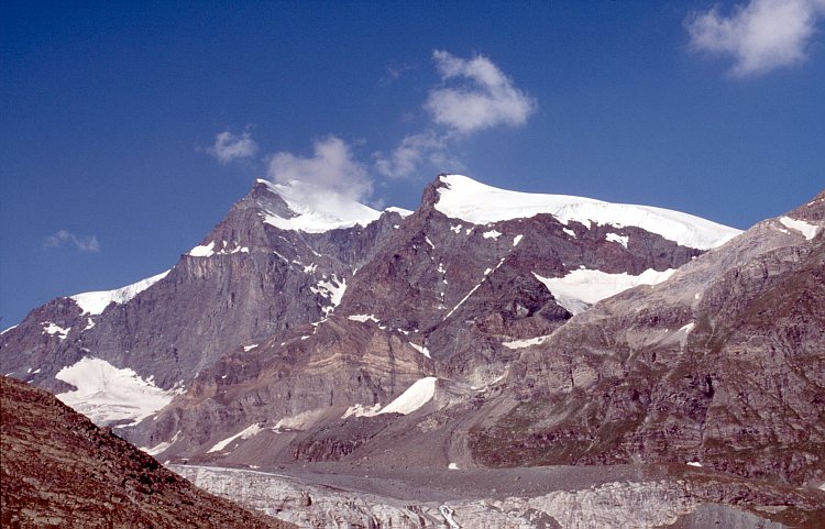 Das Strahlhorn (4190 m), knapp rechts daneben das Fluchthorn (3790 m) mit dem Allalingletscher. Darunter der Schwarzberggletscher.