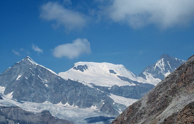 Links das Allalinhorn (4027 m); nach rechts der Ostgrat oder Hohlaubgrat. In der Mitte der Alphubel (4207 m) mit dem Feegletscher. Rechts das Täschhorn (4490 m).