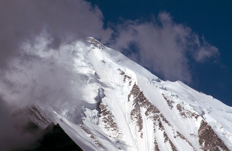Blick nach Westen auf das Weißhorn (4505 m) von der gegenüberliegenden Seite des Mattertales aus im Anstieg zur Domhütte (2940 m). Rechts der Nordgrat.