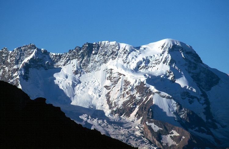 Von links nach rechts: Östliches (4141 m), Mittleres (4159 m) und Westliches Breithorn (4165 m). Darunter der Breithorngletscher.
