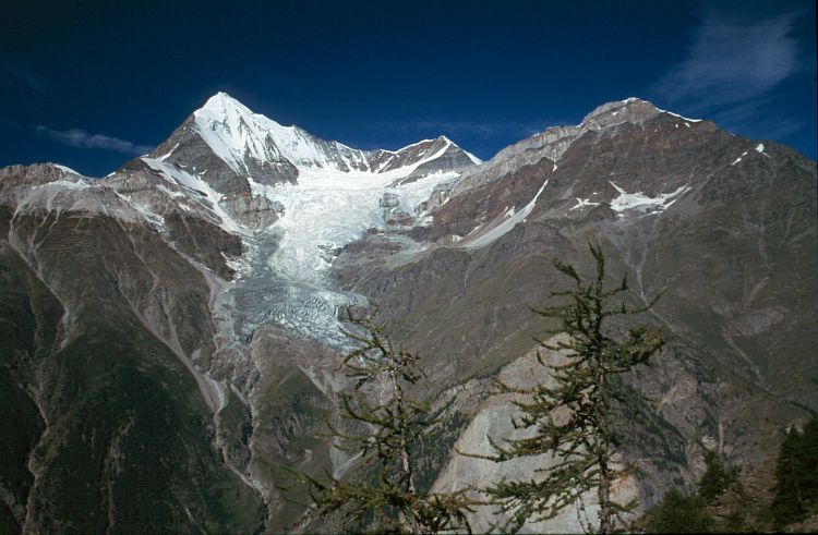 Blick nach Westen auf das Weißhorn (4505 m) von der gegenüberliegenden Seite des Mattertales aus