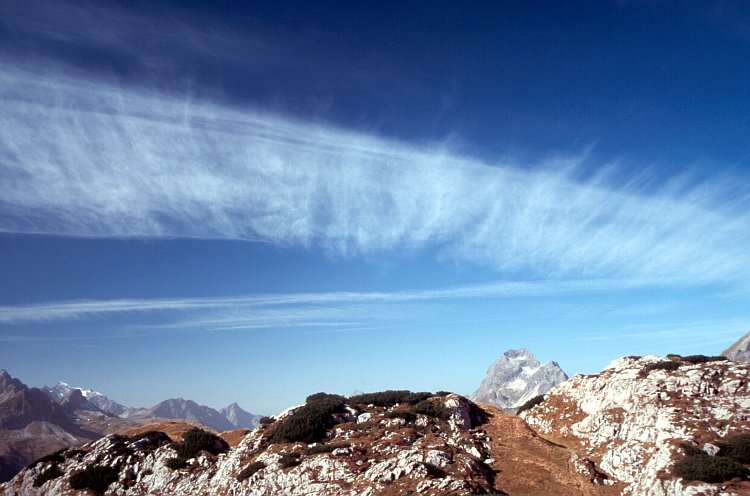 Während des Aufstiegs auf den Biberkopf (2599 m) erlaubt die zunehmende Höhe den Blick über die Felsrippe im Vordergrund hinüber zum Widderstein (2533 m)