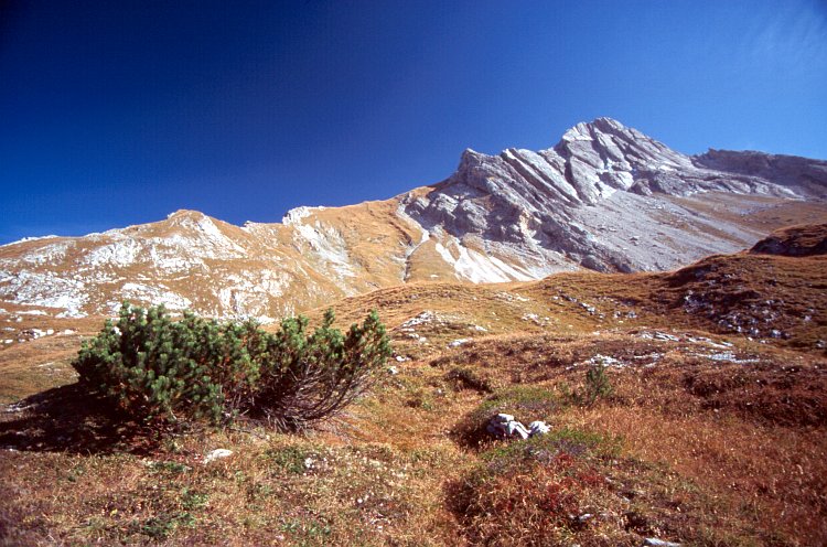 Der Biberkopf (12599 m). Die Weitwinkelaufnahme täuscht über die tatsächliche Steilheit des Geländes hinweg, ohne einige Mühen und Kletterpassagen ist der Gipfel, auf den Weg über den Grat führt, nicht zu erreichen.